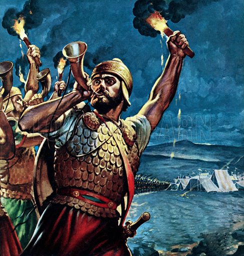He leads a night attack with trumpets, torches, and clay jars, creating chaos among the Midianites and securing a stunning victory (Judges 7:16–22).