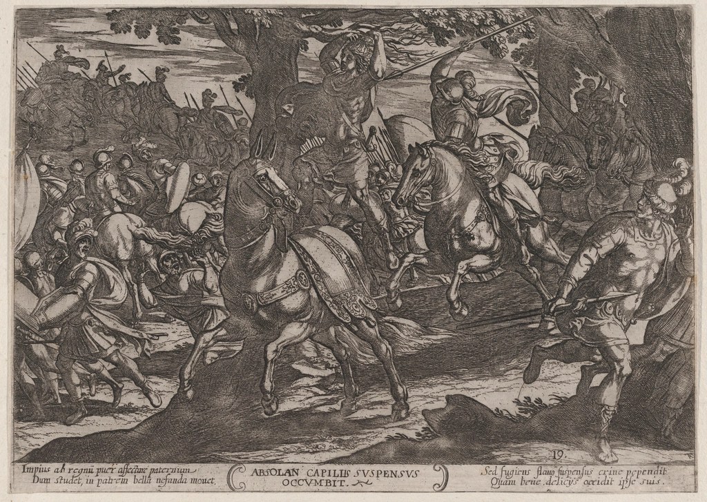 The rebellion ends in battle. Absalom, riding beneath a tree, is caught by his hair and left to hang (2 Samuel 18:9).